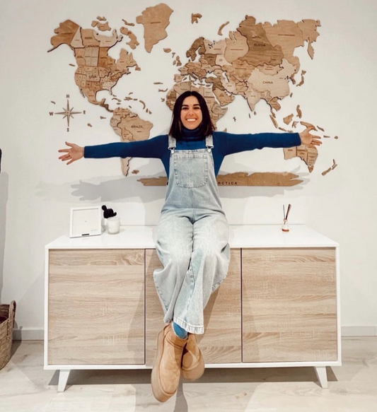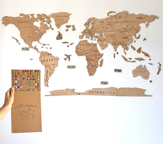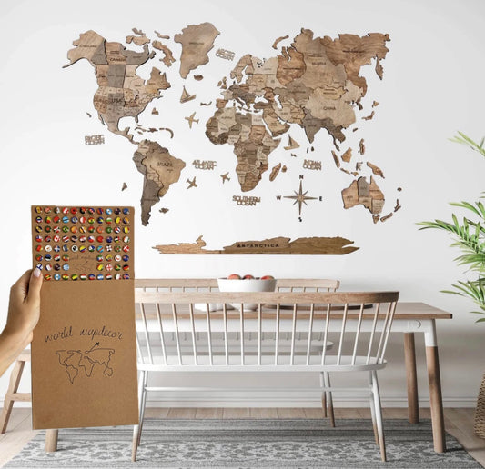 3D Mapa decorativo "Minimalist" em Madeira 100% natural com oferta dos pins com bandeiras de todos os países do mundo!
